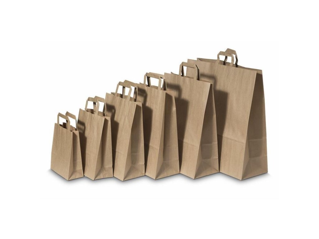 Hnědá papírová taška ve strojním provedení s plochým papírovým uchem