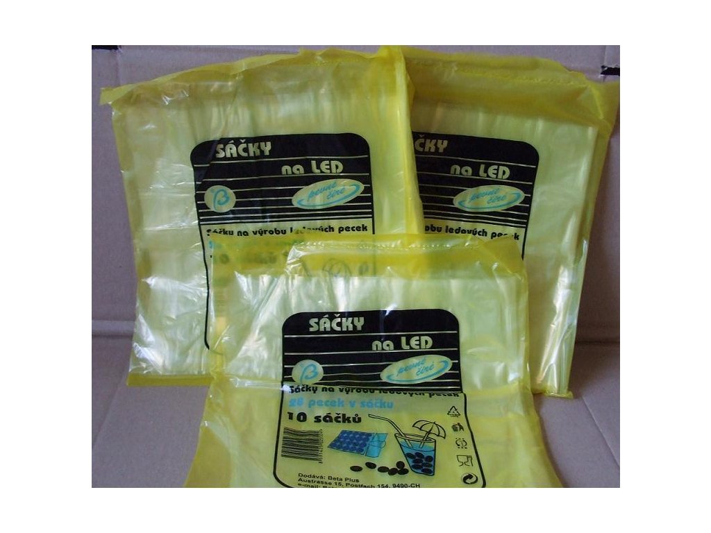 Sáčky na tvorbu ledových kostek. Balení 10 šáčků. Stačí naplnit vodou a vložit do mrazáku. Po úplném zamražení se pecky odlamují jednotlivě.