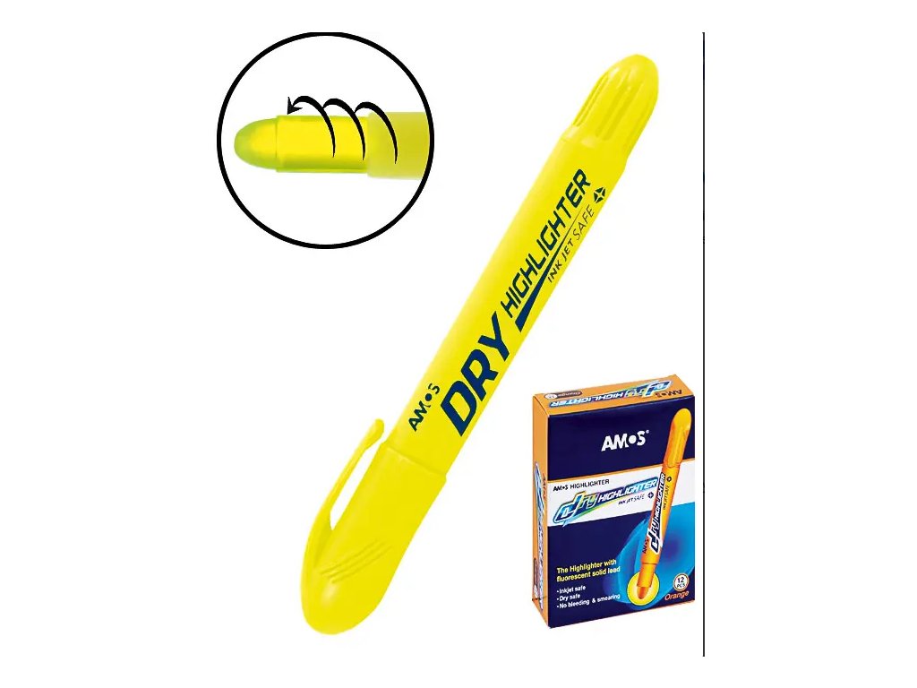 zvýrazňovač s průsvitnou náplní, šroubovací mechanismus, bez ořezávání, nerozmazává inkoustový tisk, nepropíjí se, šíře stopy 10 mm